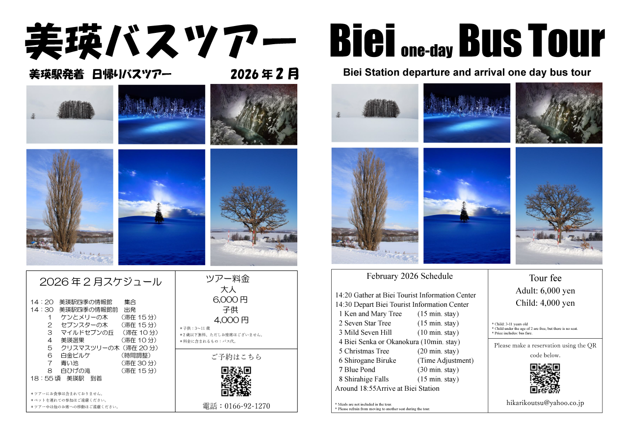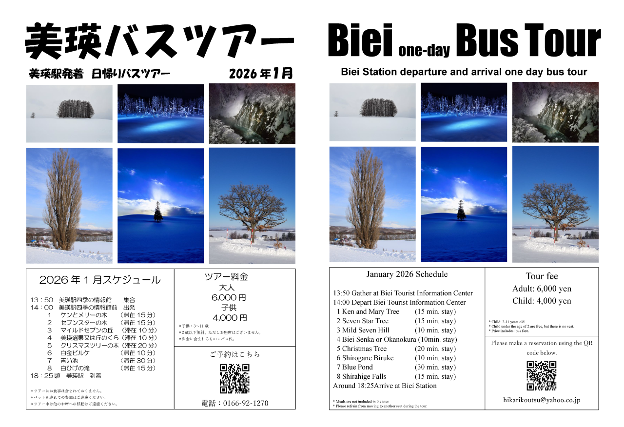1月と2月の美瑛日帰りバスツアーのご紹介です。